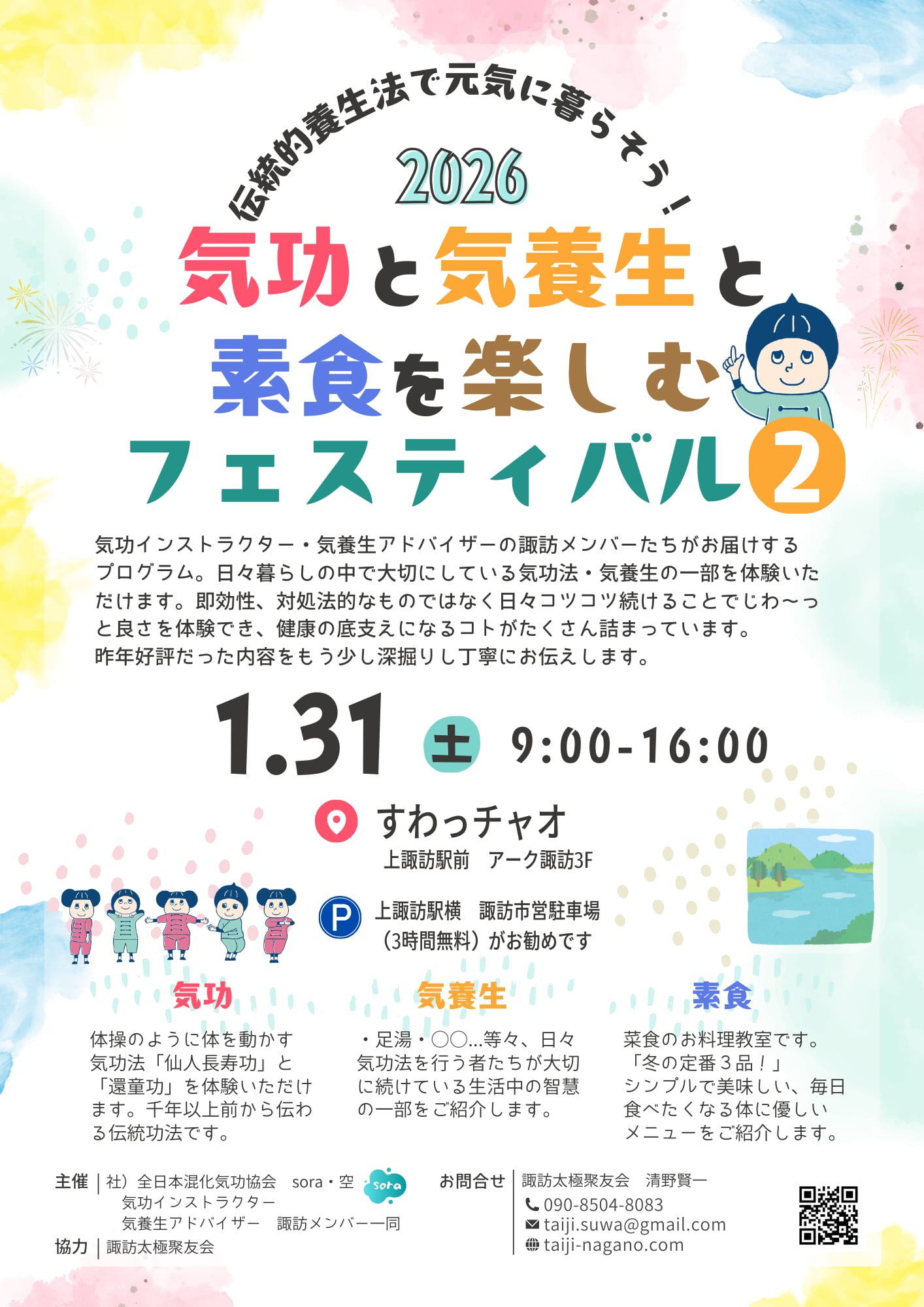 来年1/31、「気功と気養生と素食を楽しむフェスティバル」が上諏訪にて開催されます!