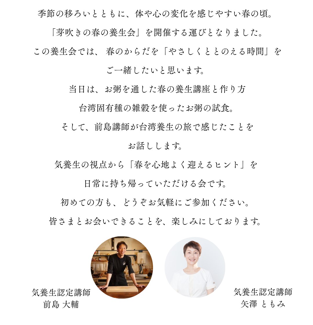 当日は、冬を過ごしたからだをやさしくととのえる 一つとして、台湾の固有種でつくる雑穀粥を囲みつつ、春を心地よく迎えるヒントを体験して感じていただければ嬉しいです。