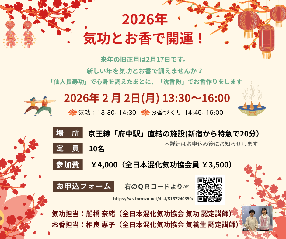 このたびは新春特別企画「2026年 気功とお香で開運!」にご興味を持っていただき、誠に有難うございます。【お申込】こちらのフォームにご記入のうえ、送信ください。折り…