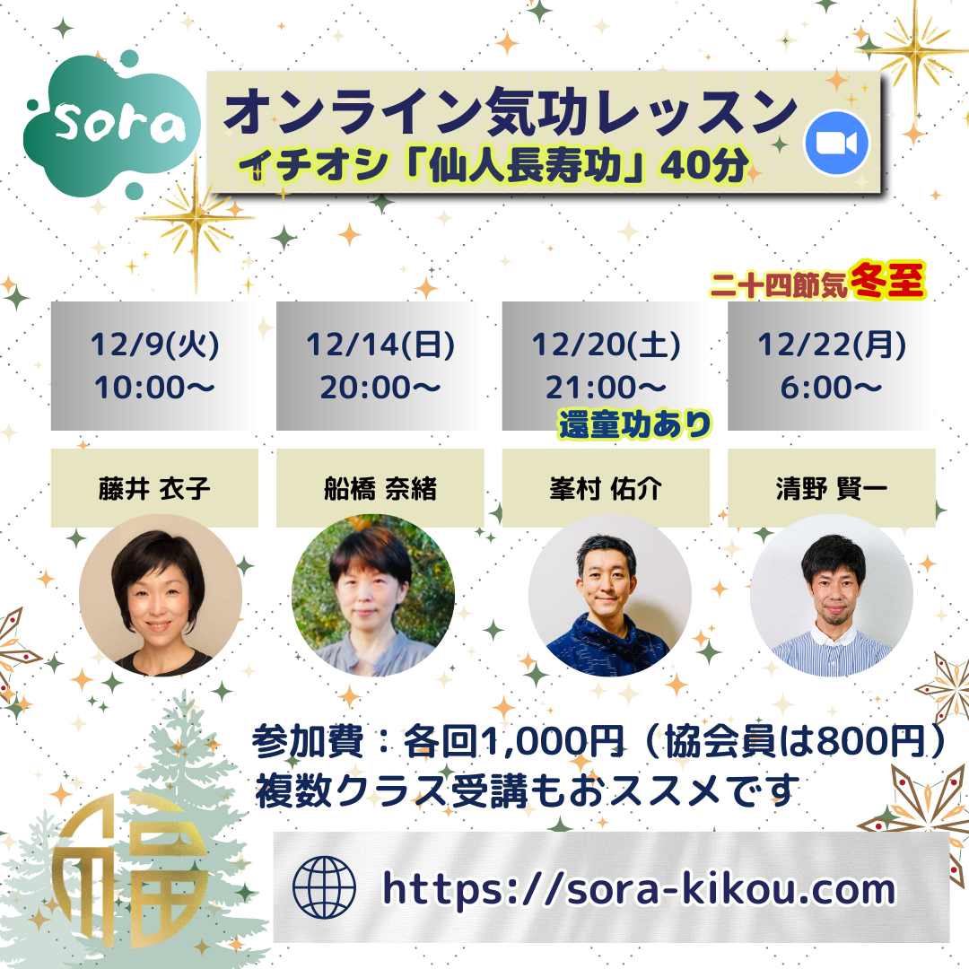 「soraのオンライン気功レッスン」で仙人長寿功・還童功を体験できます。